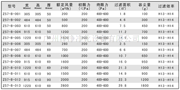 20170826212235無隔板高效過濾器技術參數標準尺寸: