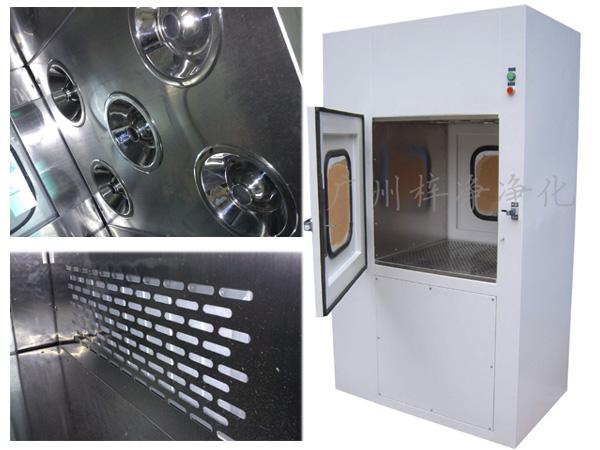 風淋傳遞窗是根據風淋室模式設計,使風經過高效過濾器潔凈后由不銹鋼噴嘴以20m/s以上的風速噴射。風淋傳遞窗特點