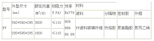 FV型亞高效過濾器(塑框)型號尺寸及其它技術參數: